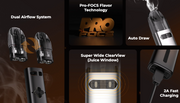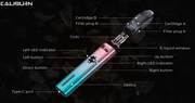 Caliburn Explorer pods are divided into two halves, each with its own coil and a side-filling port, so you can top up each pod with two different flavours and keep them separate. The Explorer is compatible with Caliburn G and G2 coils which all work best with 50% VG e-liquids. Lower-resistance options provide a looser inhale, while higher-resistance coils deliver a more restricted puff. You can also rotate the pod to increase or decrease the airflow.